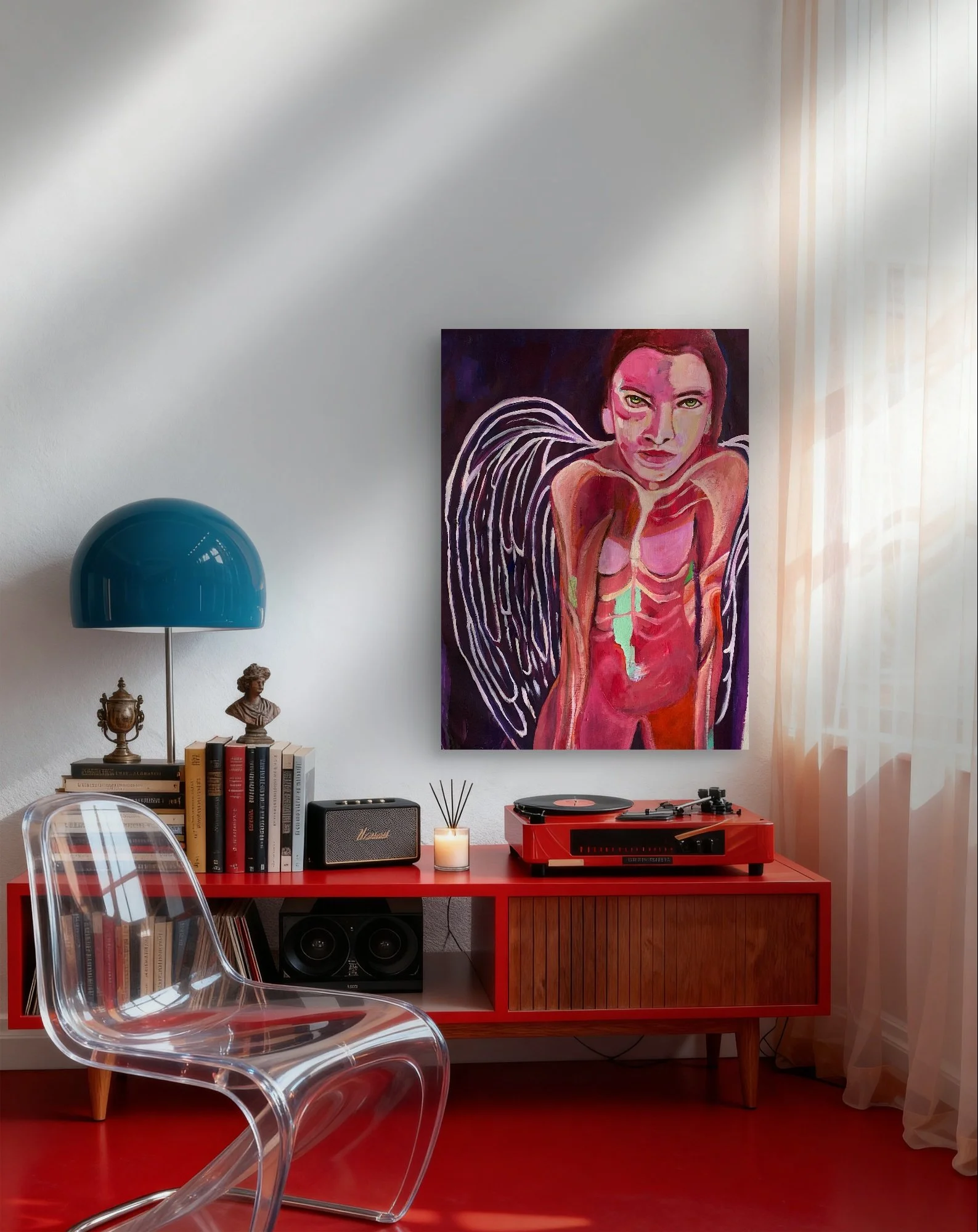 This painting features a limited palette and a solid background, making the viewer focus entirely on the figure itself. The artist’s intention was to highlight the body and wings in their most vulnerable state — as if the figure is about to leap out of the canvas.